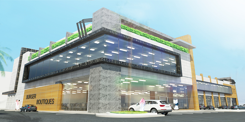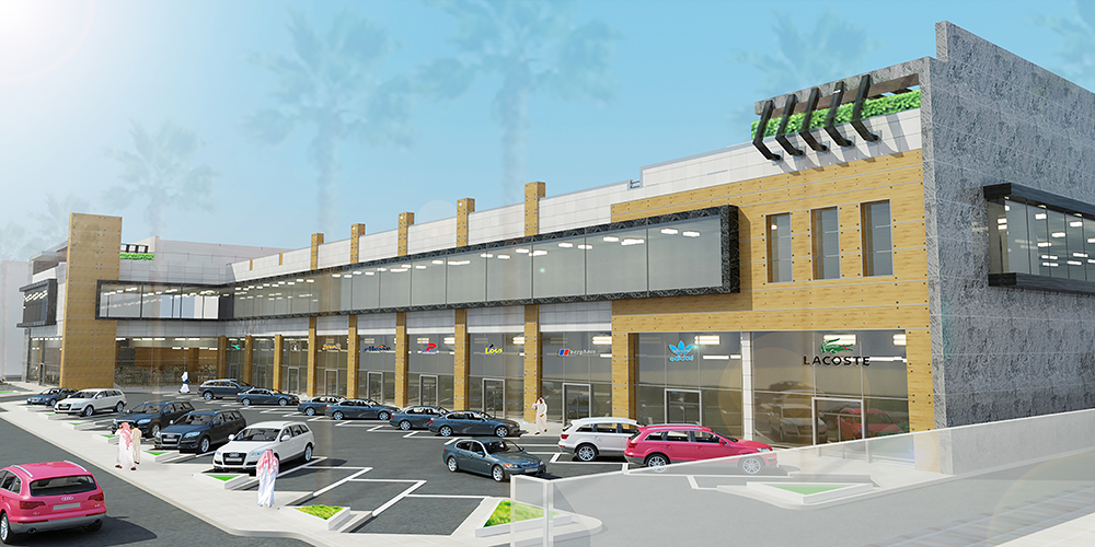 Commercial 5 stories mall located in Riyadh,KSA with parking areas at basement, shops at ground and mezzanine and office spaces at first and roof floors.