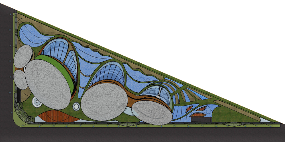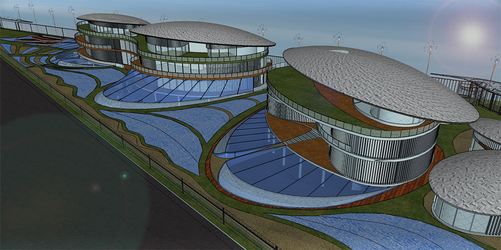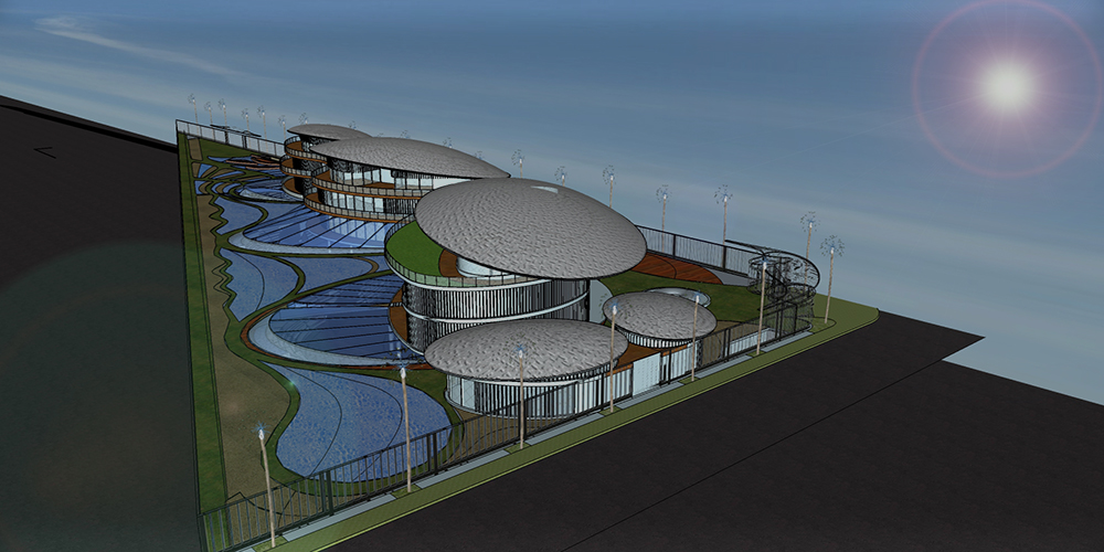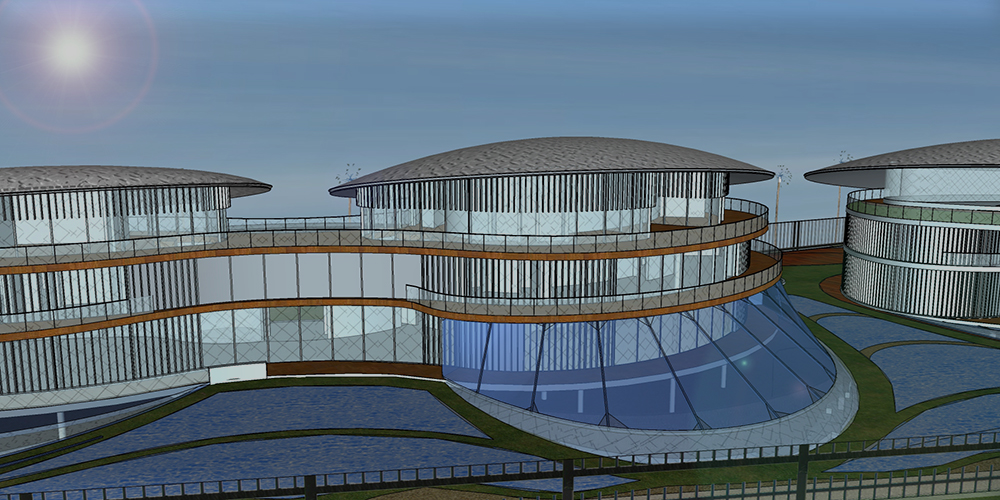 Private 5 stories palace located in Riyadh,KSA with full plot area basement and ground floors and elliptical separate buildings starting from first floor up to roof. Basement floor with a lot of water features and a water channel while ground floor has a lot of landscape green areas with steel bridges to cross over basment water channels. A lot of large spans areas and a roof garden at second floor. All buildings are covered at top with a high finish steel sheds.